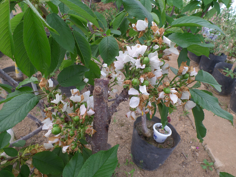 櫻桃屬于異花授粉的果樹,在盆栽過程中注意品種搭配,最佳辦法是每盆嫁接2~3個品種。上盆的櫻桃應(yīng)選擇果個大、色澤艷麗、連續(xù)結(jié)果能力強的品種。